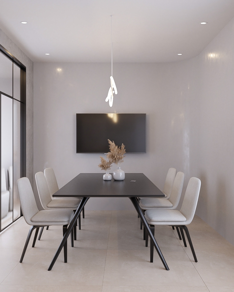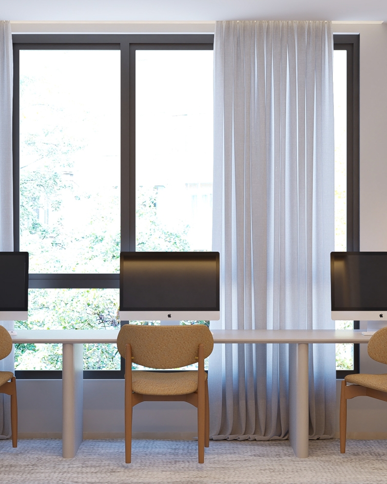 Com um layout inteligente, mobiliário ergonômico e uma paleta de cores neutras e sofisticadas, o espaço transmite organização e serenidade. Os elementos arquitetônicos foram pensados para valorizar a amplitude visual, permitindo que o escritório se torne um local de concentração, criatividade e conexão.